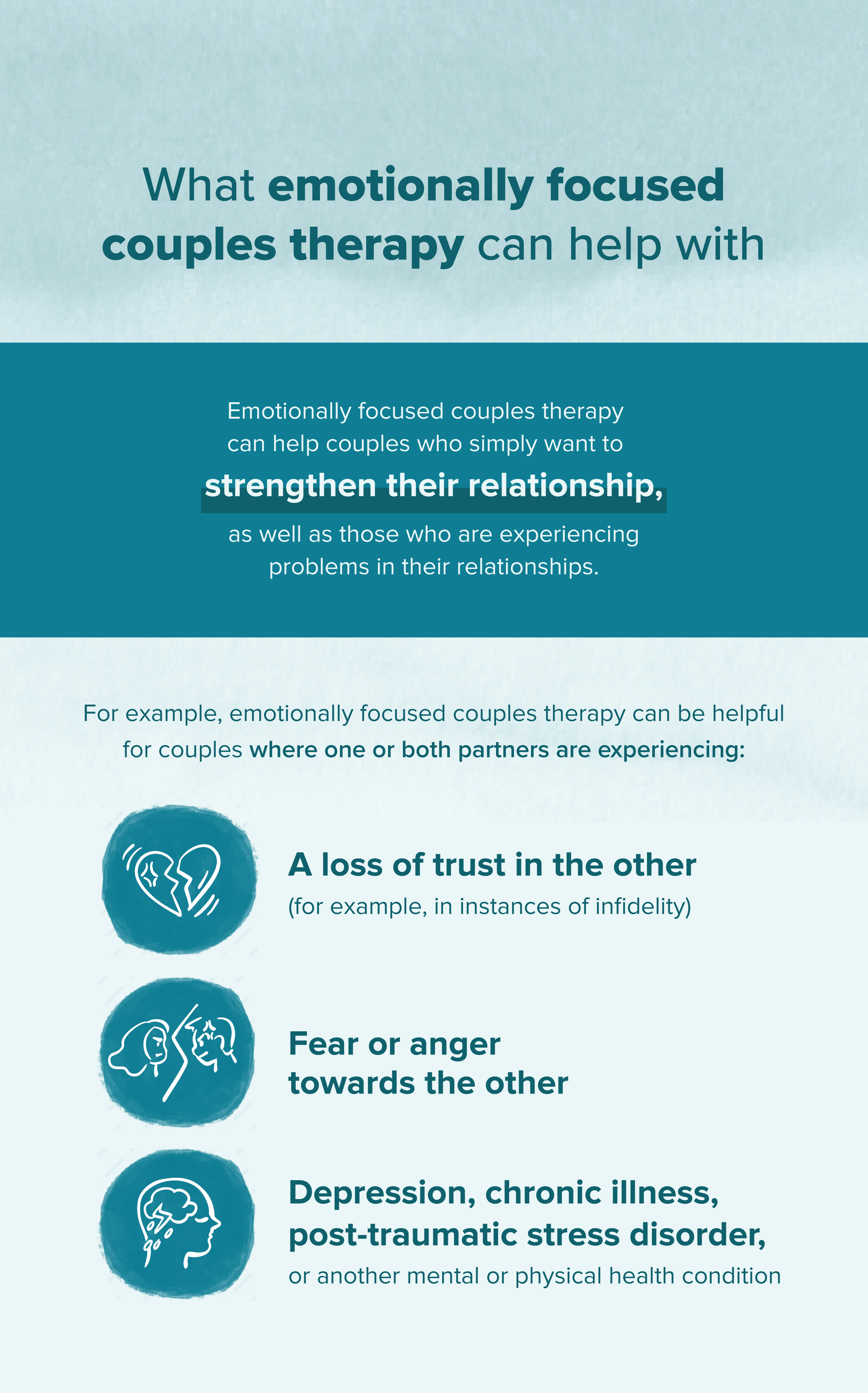 For example, emotionally focused couples therapy can be helpful for couples where one or both partners are experiencing: